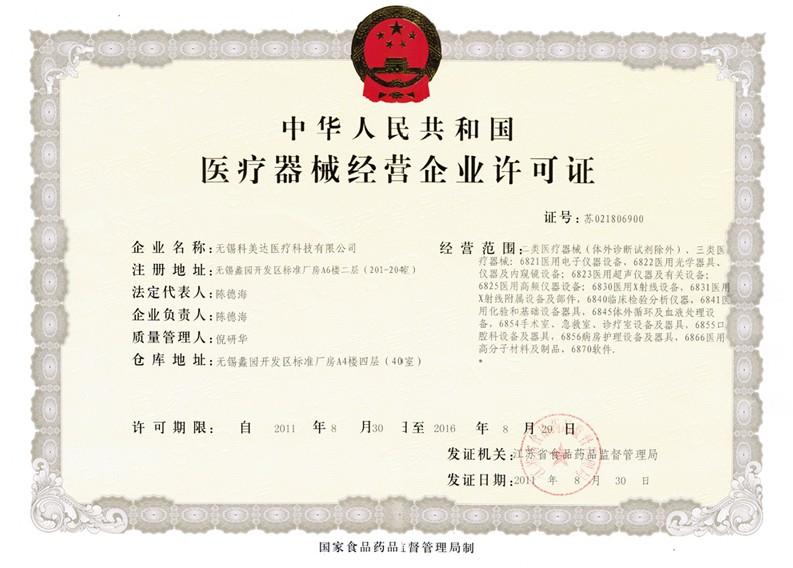 無錫科美達醫(yī)療器械有限公司于2011年8月順利取得中華人民共和國醫(yī)療器械企業(yè)經(jīng)營許證。